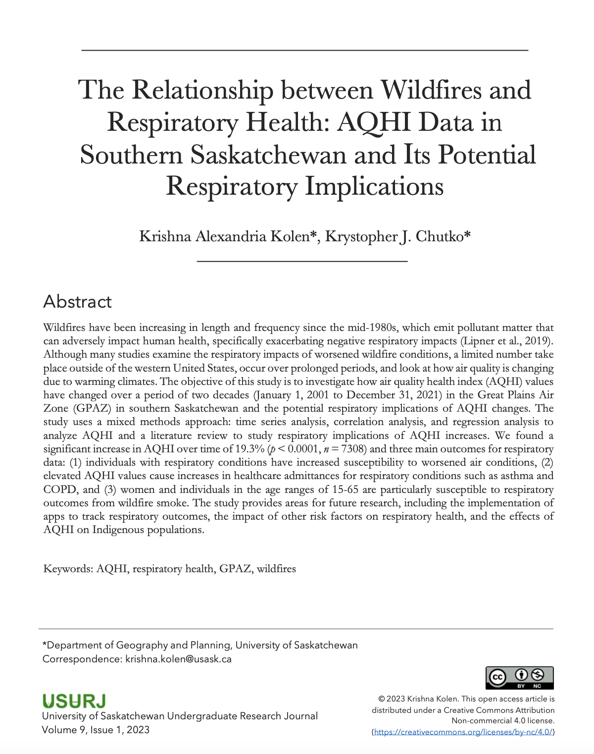 The Relationship between Wildfires and Respiratory Health: AQHI Data in Southern Saskatchewan and its Potential Respiratory Implications